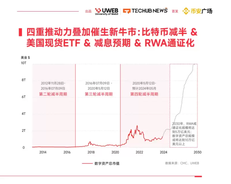 伴随着比特币下一轮减半周期的牛市,我们预见将有四重推动力共同作用:比特币的减半带来的自然供应压力减轻、美国现货 ETF 的潜在批准、市场对减息的预期,以及 RWA 通证化的推进。这些因素相互叠加,可能会为数字资产市场带来前所未有的增长和机遇。我们预计在2030年,RWA 通证化的规模可能达到5万亿美元,而数字资产的总规模有望超过10万亿美元。