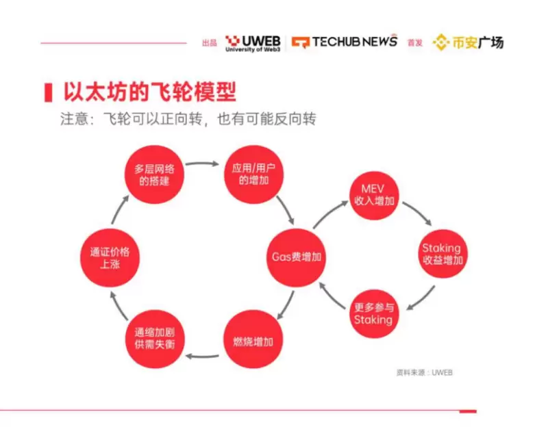 以太坊的飞轮模型是理解以太坊生态系统持续增长和扩张的关键。该模型本质上是一种自我强化的机制,通过多个相互关联的环节推动整个系统的发展和增长。