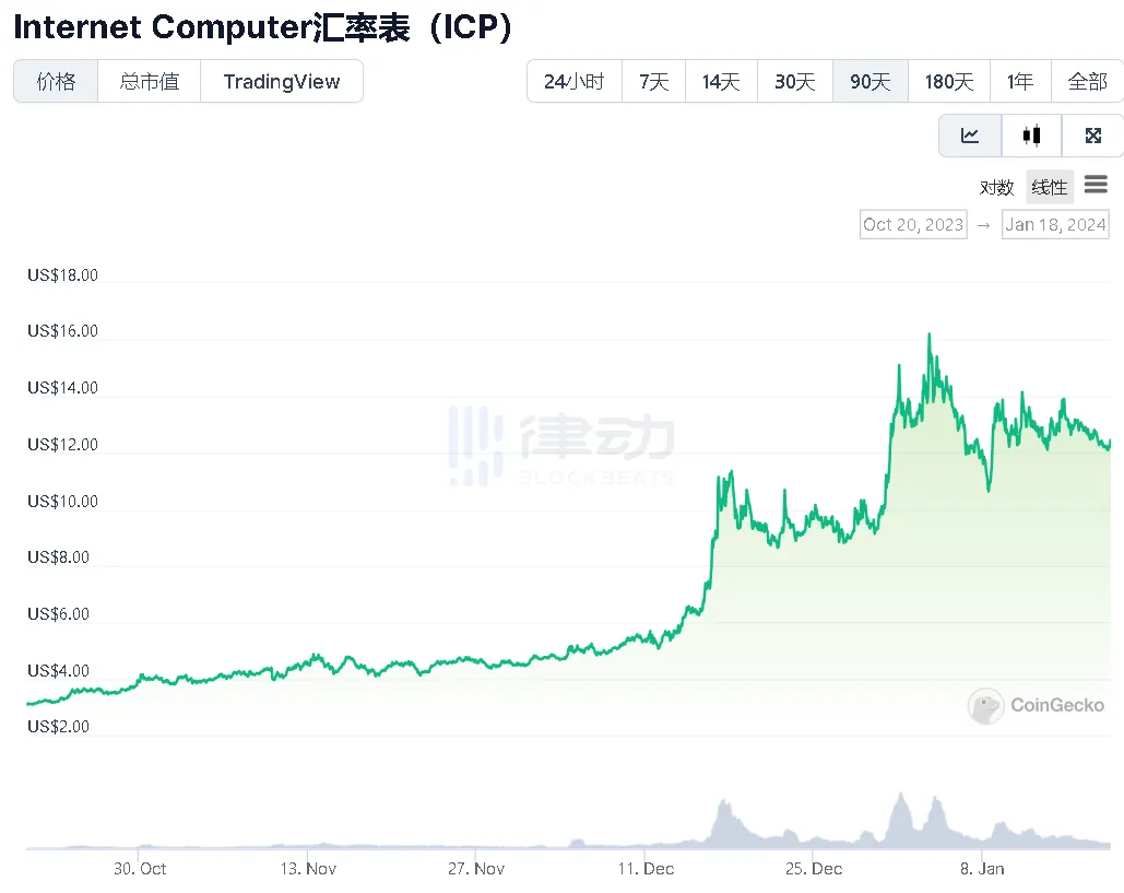 然而这一轮小牛,ICP 的价格从最初的「狗都不买」再次亮眼,累计超过 4 倍的涨幅让无数投资者重获新生。据coingecko 数据,截至撰稿时,ICP 价格达到 12.4 美元。
