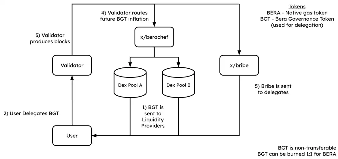 在流动性证明机制中,用户必须将其蓝筹代币例如 BTC、ETH 等向 BEX(Berachain 原生 DEX)组成流动性 LP 来得到协议治理代币 $BGT,而 $BGT 代币将负责链上节点的验证机制并具有投票治理功能(例如可以决定 LP 池代币奖励发放等)。