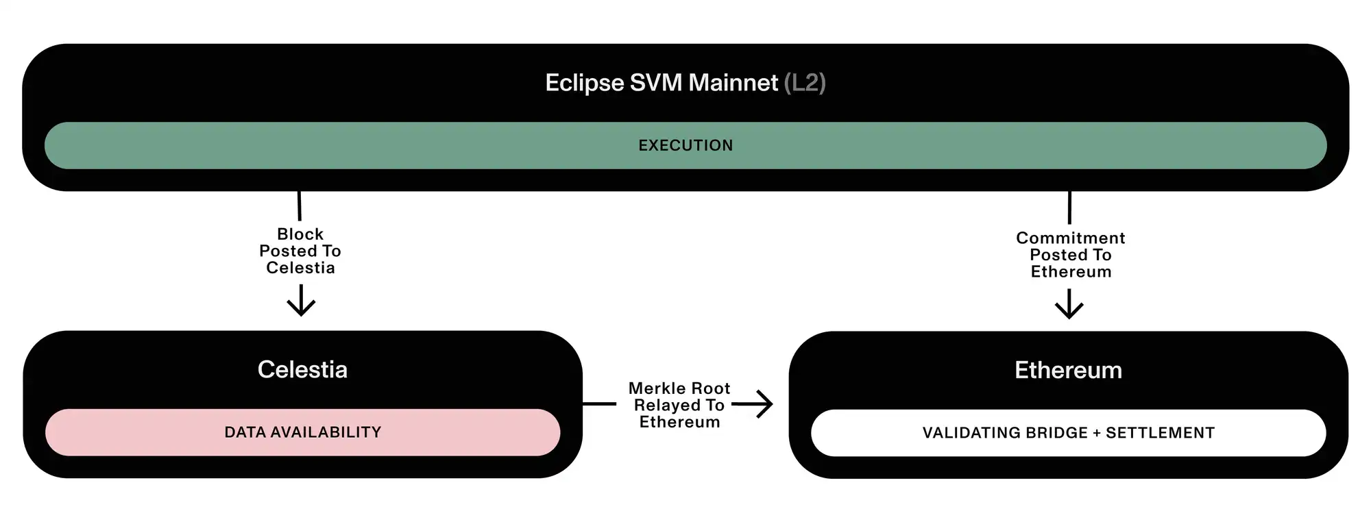 · Eclipse 是一个以太坊 Layer 2 解决方案,使用 SVM 加速交易处理,采用模块化 rollup 架构,整合了以太坊结算、SVM 智能合约、Celestia 数据可用性和 RISC Zero 欺诈证明。