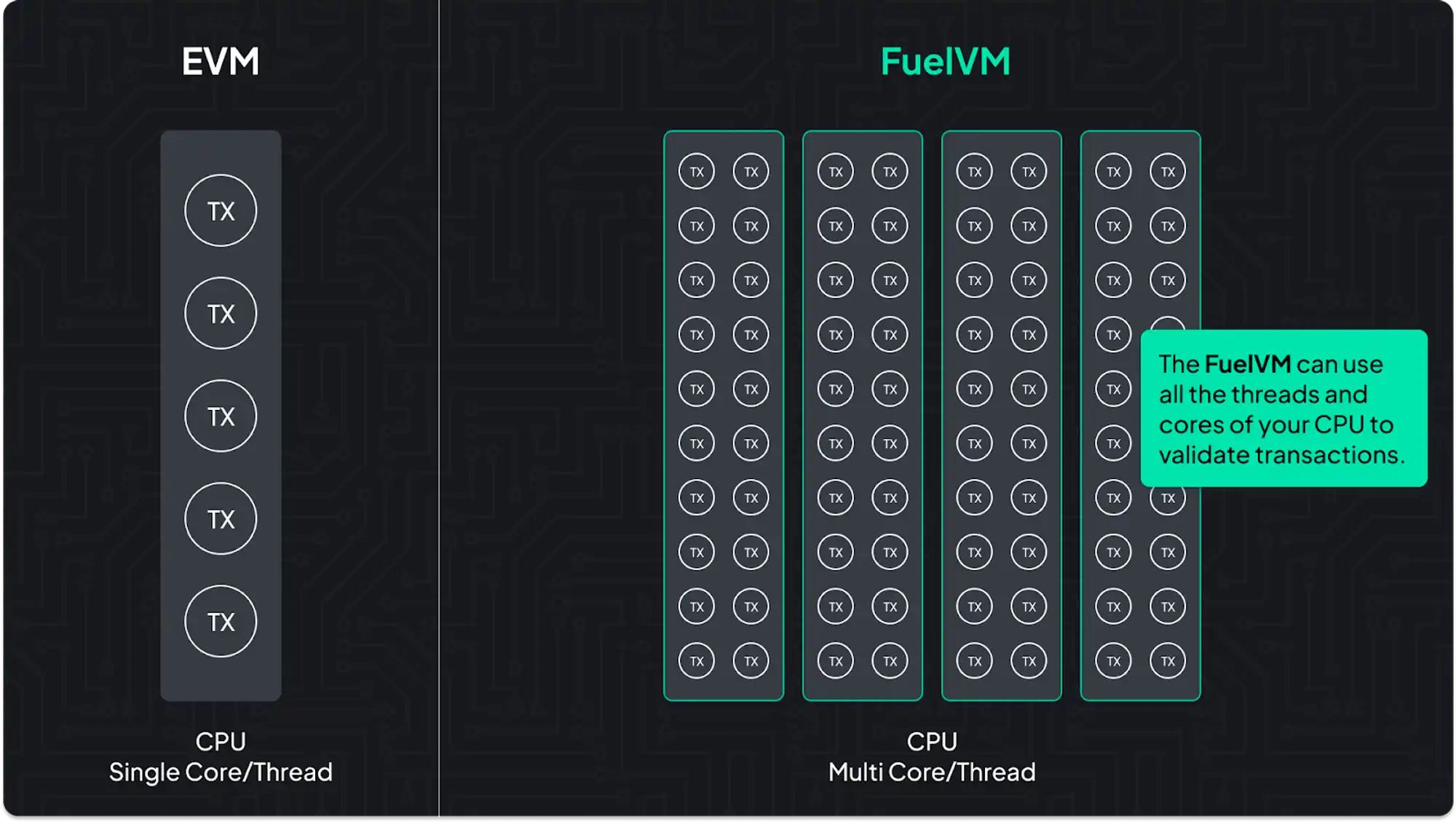 Fuel 在 UTXO 模型中引入了并行交易执行的能力。通过使用严格的状态访问列表,Fuel 能够并行处理交易,从而利用通常在单线程区块链中闲置的更多 CPU 线程和核心。这样,Fuel 就能比单线程区块链提供更多的计算能力、状态访问和交易吞吐量。