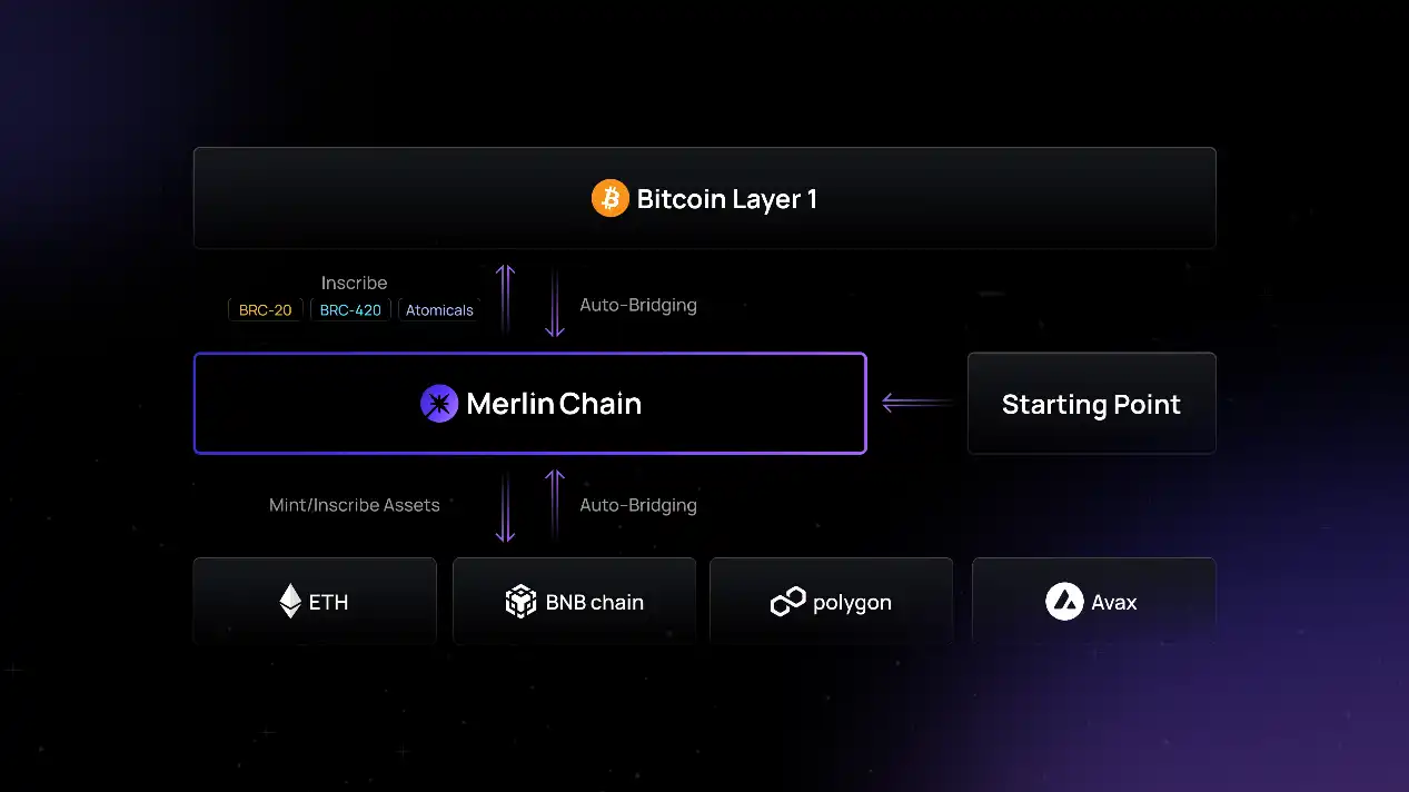 比特币一层的交互对于新用户具有一定门槛,限制了新资金的涌入。Merlin 希望二层成为用户的「起点」,用户无论是存入 BTC 还是 USDT/USDC/ETH/BNB 等代币,都可以在 Merlin 上体验 BTC 的原生玩法。