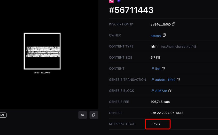 - RSIC 工厂(祖父铭文):用于生产 RSIC 分发中心,当前已被打入中本聪地址(四舍五入相当于项目方已经销毁该铭文,无法再用它继续生产其子铭文了)。(祖父铭文还用到了 metaprotocol)