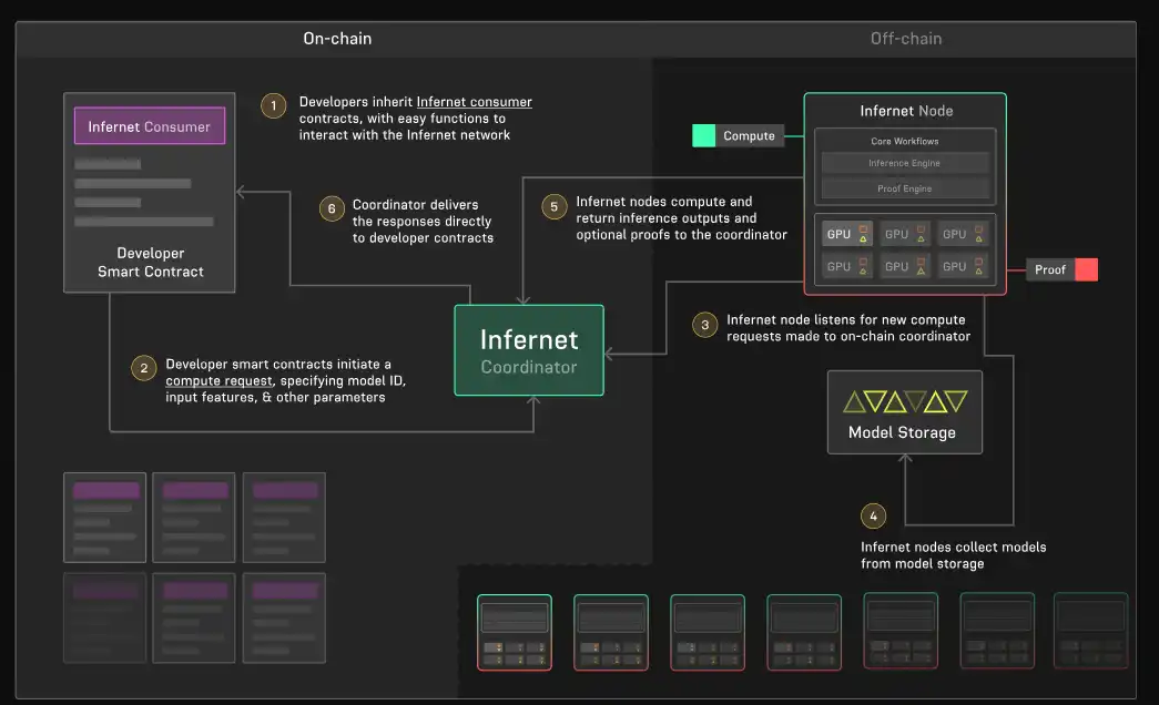 Ritual 希望将 Infernet 发展为模块化的执行层套件,与生态系统中的其他基础层基础设施互操作,从而成为 web3 领域人工智能的关键点,从而允许任何链上的每个协议和应用程序都可以使用 Ritual 人工智能协处理器。使用给定的模型和功能,智能合约可以请求 Infernet 计算一些输出和证明。