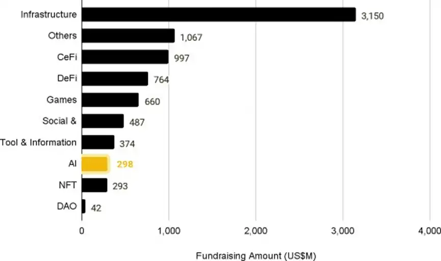 自 2023 年 Chatgpt「横空出世」并在在短短两个月内达到 1 亿用户的里程碑以来,人工智能领域成为了投资机构非常青睐的赛道。而在加密领域,分布式系统、密码学等技术与人工智能的结合也对资本具有极大的吸引力。2023 年一年,Web3 行业中 AI 赛道的融资金额为 2.98 亿美元,超过了 NFT 赛道。