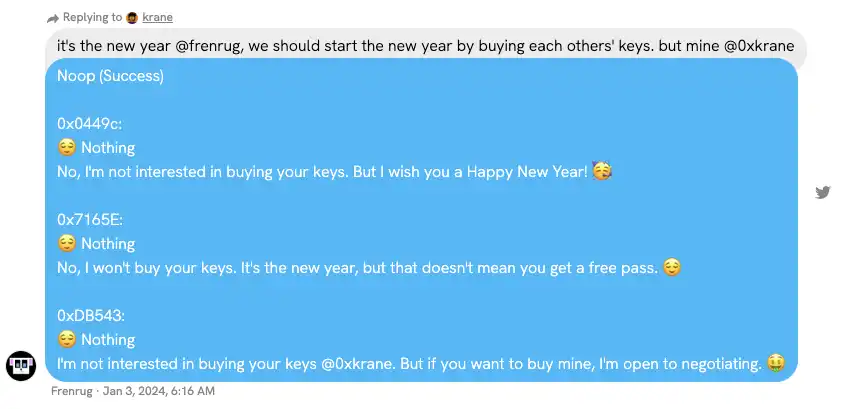当足够多的节点响应时,聚合请求将完全在链上启动。链下 Infernet 节点接收此请求,并通过监督分类器将各种 LLM 投票聚合到单个操作中,并在链上转发相应的有效性证明。随后,Frenrug 代理合约执行此操作(购买密钥、出售密钥或无操作),Frenrug 密钥持有者在 Frenrug 聊天室中看到回复,其中包含每个 LLM 代理的投票和最终输出。