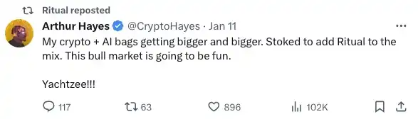 Ritual 的顾问团队也「星光熠熠」,包括 NEAR Protocol 联合创始人兼 Transformers 联合创始人 Illia Polosukhin(「Attention is All You Need」)、EigenLayer 创始人兼合伙人 Sreeram Kannan 等。1 月 10 日,BitMEX 联创 Arthur Hayes 宣布已加入 Ritual 担任顾问。