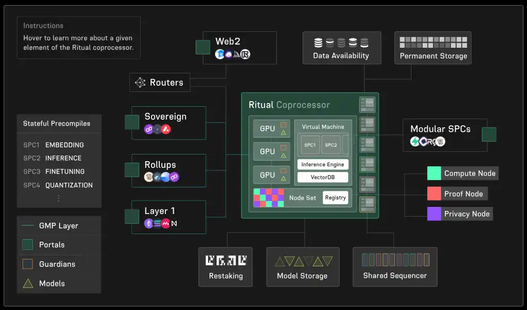 Ritual Superchain :一套主权模块化执行层,每个层都包含专门的状态预编译(SPC),适合不同类别的任意计算,主要围绕人工智能模型,从经典模型到基础模型 GMP 层促进现有区块链和 Ritual Superchain 之间的互操作,Ritual Superchain 充当所有区块链的 AI 协处理器。Ritual 的 AI VM 不仅包含 SPC,还包含促进优化执行的基础层基础设施,包括推理引擎二进制文件和矢量数据库。