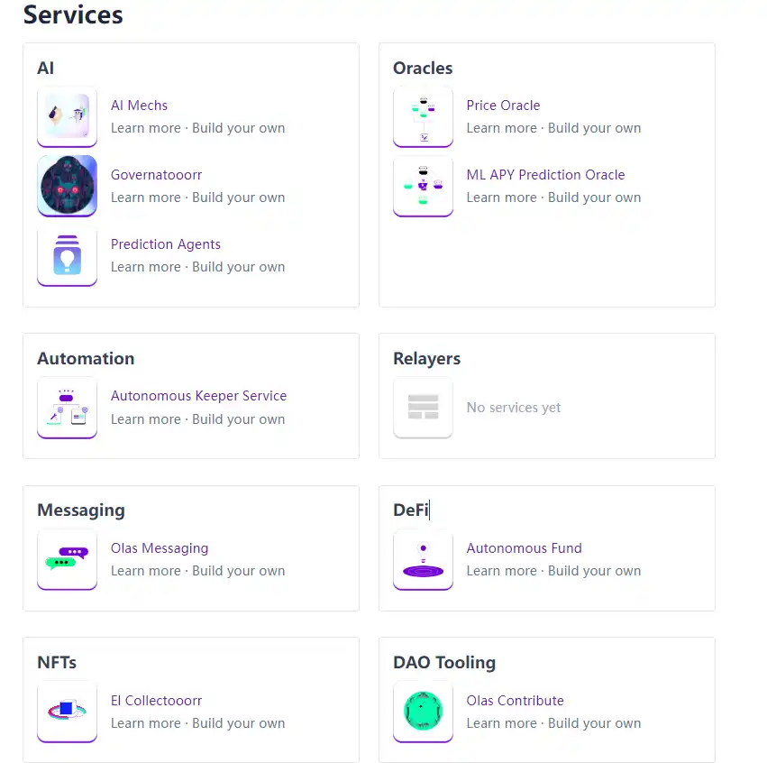 从 Autonolas 官网给出的产品合集来看,其涉及到的与加密行业相关的业务包括但不限于使用 AI 代理来预测市场、预测某些协议的 APY 收益、充当预言机提供更准确的链下数据、帮助 DAO 进行治理、自动管理运维智能合约和自动建立 DeFi 资金池等等。