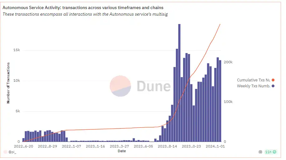 从数据上看,该项目的 AI 代理服务使用量还在持续增加。由于不挑合作的项目,Autonolas 理论上可以成为所有加密项目的标配,为自己项目中需要自动化的地方加上一层 AI 代理能力。