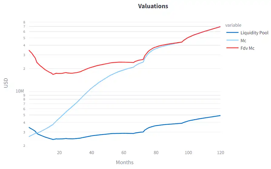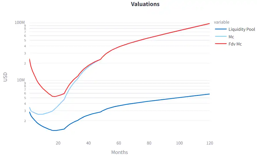 图 4 显示了图 3 给出的两种不同归属计划下 QTM 模拟得出的代币和流动性池估值。值得注意的是,纵轴是对数刻度。两种情况下,推出时的完全摊薄估值 (FDV) 市值 (MC) 均为 4000 万美元。两种情况都显示出相似的曲线形状,其中 FDV MC 在模拟开始时下降,并在一段时间后开始上升。流通的 MC 仅在快速归属方案中下降,但在 8 个月后也开始增加。在许多 Web3 代币发行中都可以观察到前 2 到 3 年估值下降,这是由于初创公司仍处于建设阶段时释放到市场的大量代币供应造成的。随后,假设商业模式、代币设计和 GTM 方法成功,由于需求增加,估值可能会再次上升。
