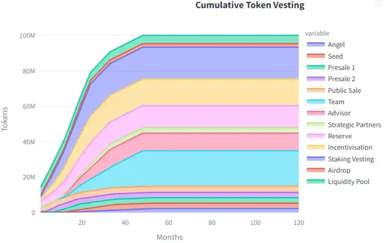 在缓慢归属的情况下,需要 8 年才能将所有代币完全释放到经济系统中;而在快速归属的情况下,则需要 4 年。这包括从代币发行开始的时间段,包括锁仓,大多数投资者将提前完成归属。