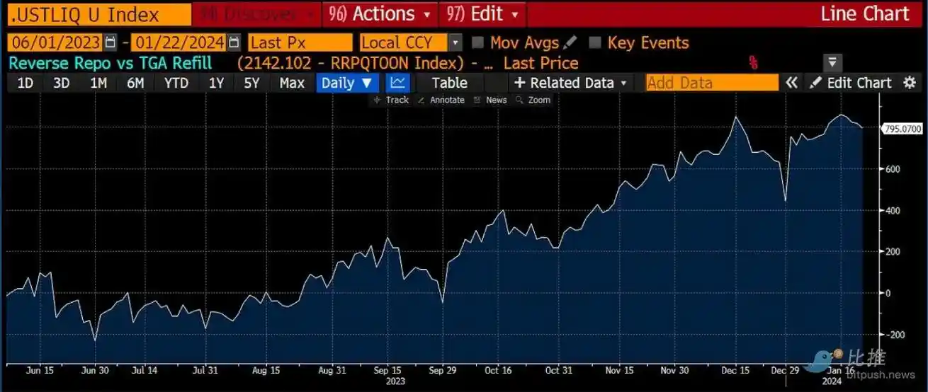 2023 年 12 月中旬,在 FOMC 新闻发布会上,鲍威尔宣布他们正在讨论 2024 年降息问题。这与他两周前的言论发生了戏剧性的转变,当时他向市场保证美联储将保持紧缩,以确保通货膨胀不会卷土重来。市场认为这意味着美联储本轮加息周期的首次降息将发生在今年 3 月。随后,本月早些时候,达拉斯联储行长 Logan 抛出了一个烟雾弹,即当 RRP 余额接近零时,量化紧缩 (QT) 的步伐将逐渐放缓。理由是,美联储不希望在停止印钞时,美元流动性出现任何问题。