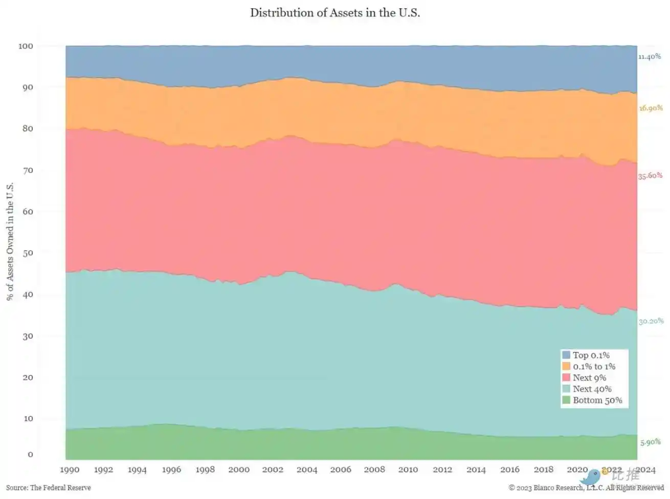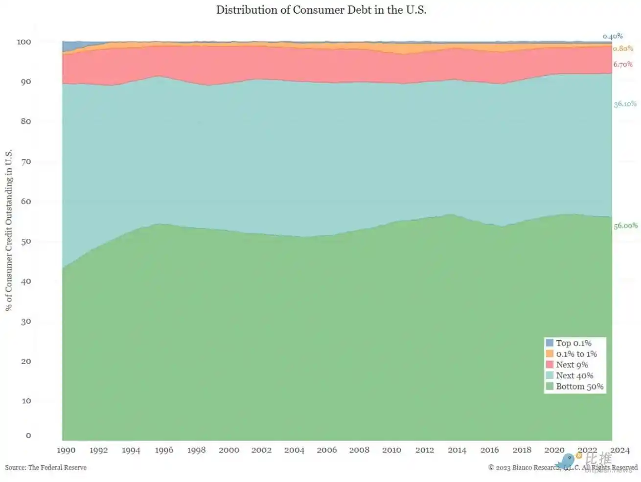 前 10% 的人持有约 65% 的金融资产,但只持有约 8% 的债务。底层 90% 的人持有 92% 的债务,但只持有 35% 的资产。