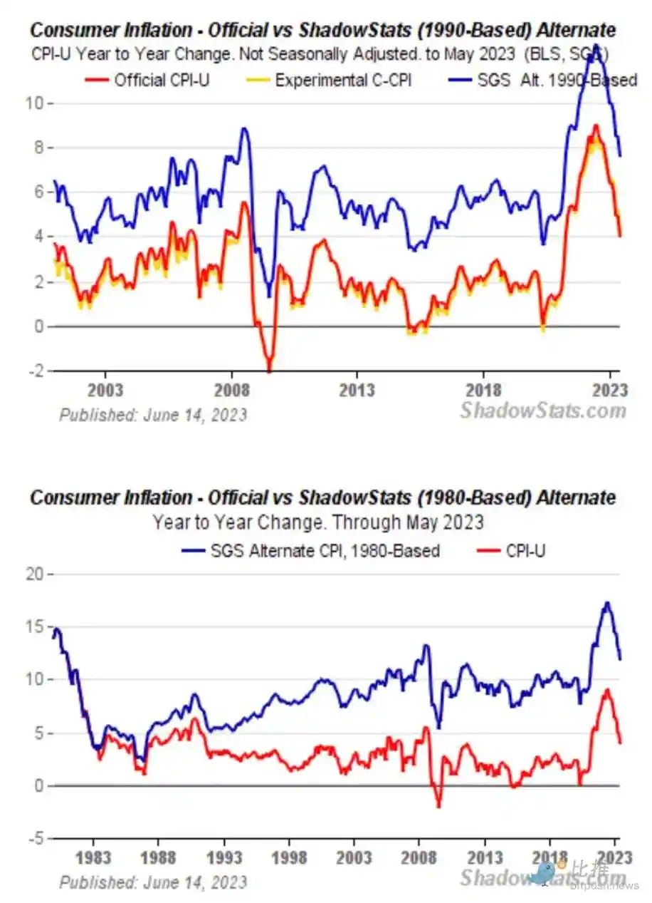 目前的消费者价格指数(CPI)计算方法是 Fugazi。如果我们回到 1980 年或 1990 年的 CPI 计算方法,实际通胀率约为 +10%,而你在新闻中读到的通胀率为 +3%。