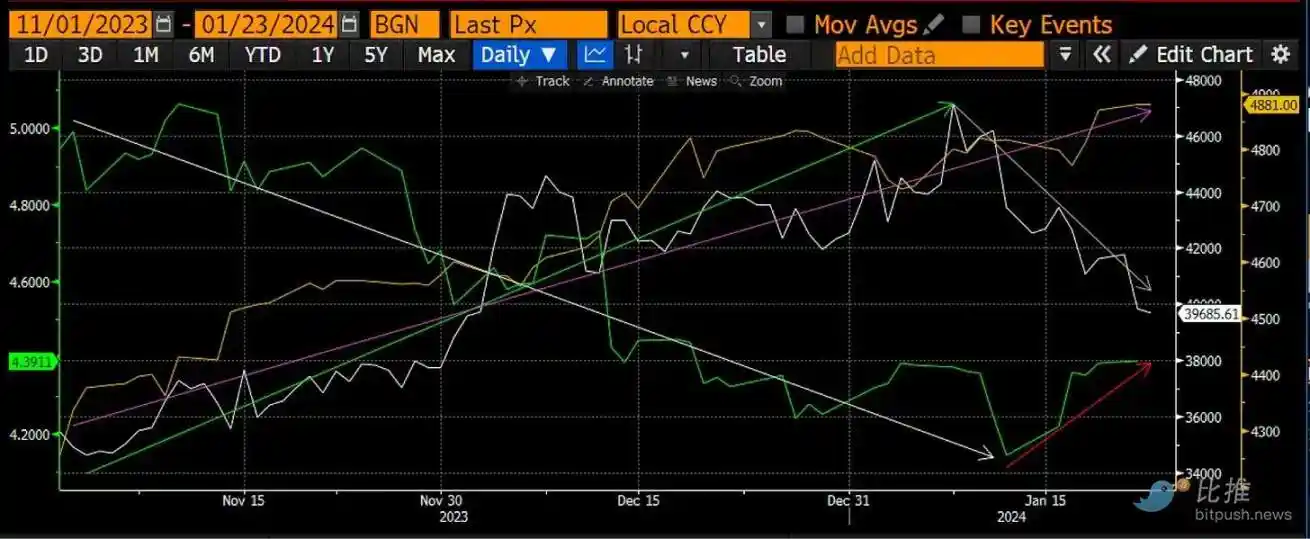 这张繁忙的图表显示了比特币(白色)和 2 年期国债收益率(绿色)之间的差异,它们讲述了相同的故事,而 SPX(黄色)则讲述了不同的故事。自 2023 年 11 月 1 日起,随着 2 年期国债收益率下降,比特币和 SPX 指数上涨。一旦 2 年期收益率触底并逆转方向,比特币就会下跌,而 SPX 则继续上涨。