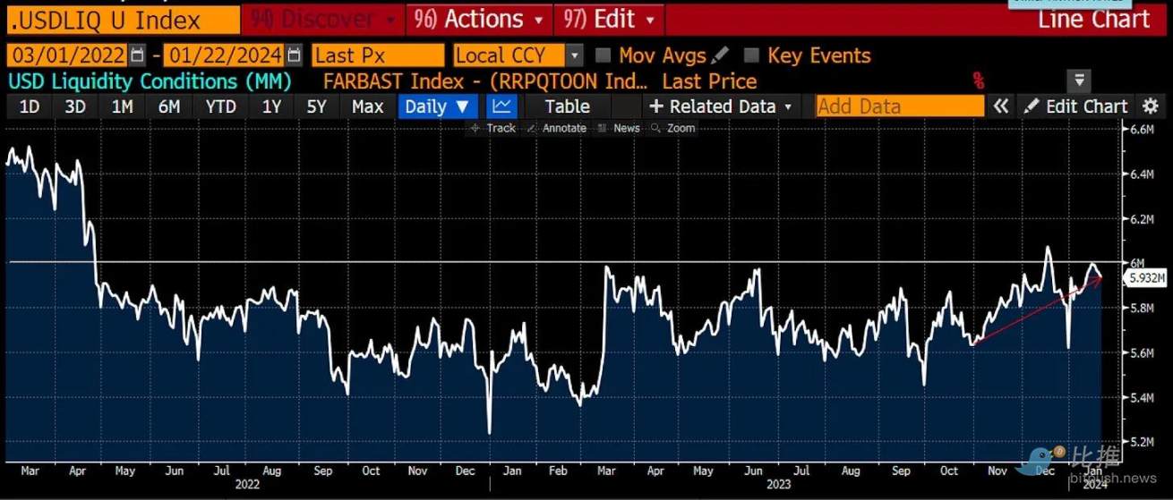 该图表是该指数的子组成部分,是 RRP 和 TGA 余额变化的净值。自 2023 年 6 月美国政府通过预算以来,已新增近 8000 亿美元的流动性。
