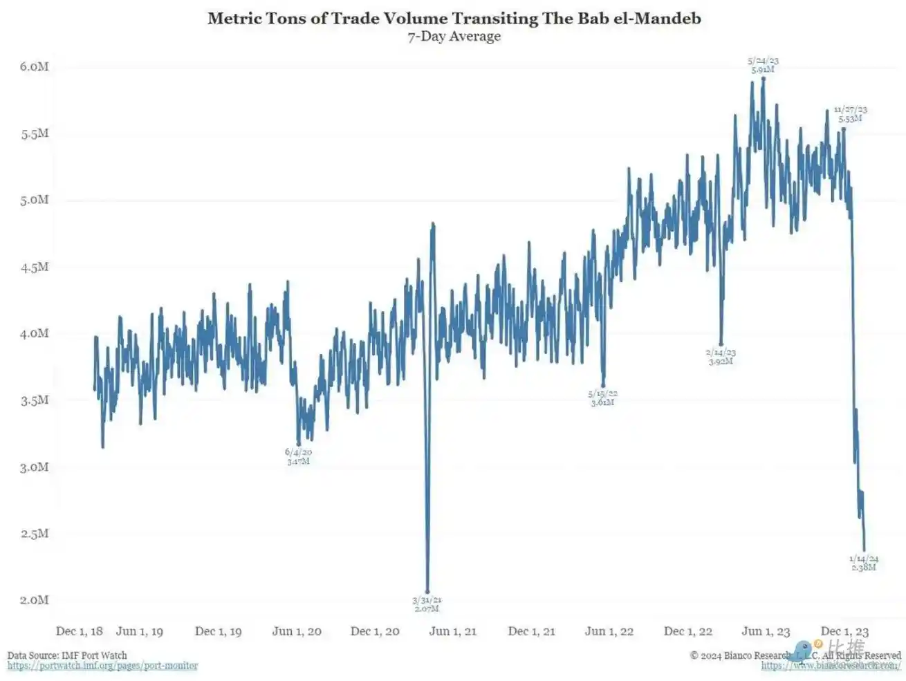 这种改道影响了全球 20% 到 30% 的运输,并增加了大量的时间和费用。对于通货膨胀统计学家来说,在其他条件相同的情况下,任何乘船旅行的东西都会变得更加昂贵。鉴于通货膨胀的运行具有相当大的滞后性,如果这种情况持续下去,其影响将在几个月后才会显现。尽管市场对美国和其他地区同比通胀数据下降感到高兴,但这可能是一场代价高昂的胜利。