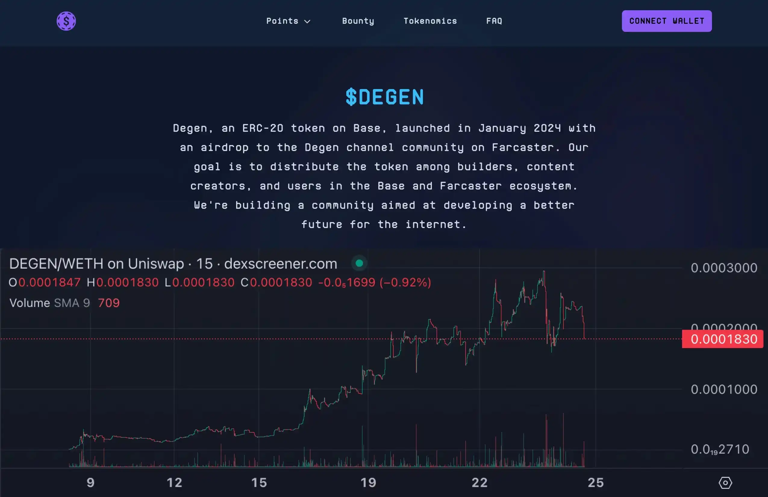 项目方想要流量,用户想要币,积分是二者之间一个微弱的连接点。比如$DEGEN 在这方面做到了很好的平衡,这是一种空投到 Farcaster 上 Degen 频道社区的 meme 币,用户在频道内发贴可以获得积分,积分则可以明确转化成代币,并且还将推出第二季空投。