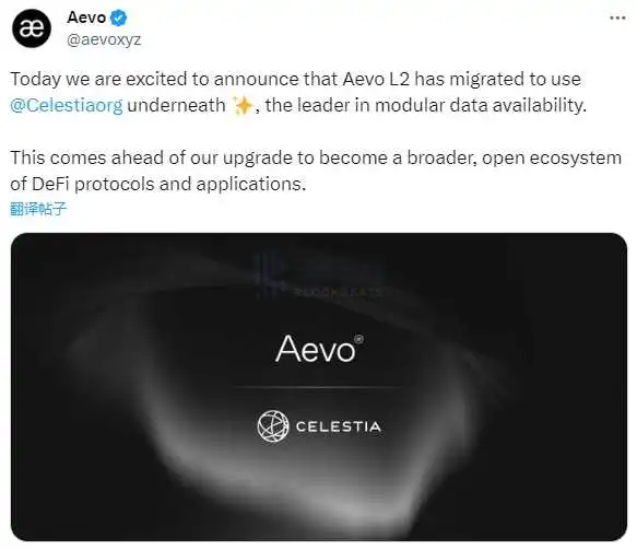 期权交易平台 Aevo 宣布其 L2 将迁移至 Celestia。 据悉,此次迁移将使 DA 成本降低 100 倍,从而使 Aevo 的 Exchange/Sequencer 的盈利能力提高 90% 以上。此次迁移将使协议加速增长。