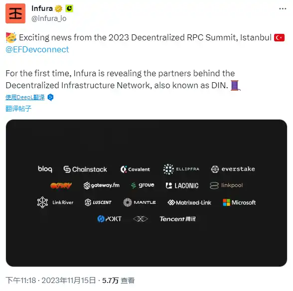 除了各类公链和客户是重要合作伙伴之外,在 2023 年 11 月的伊斯坦布尔去中心化 RPC 峰会上,Infura 官宣了与 Covalent 的合作伙伴关系,其他还包括微软、腾讯、Pokt network 等机构。