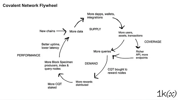 在 Covalent 的投资机构 1KX 撰写的一篇报告中,1KX 为 Covalent 的业务发展构想了一个自强化的飞轮,简单来说就是:低延迟、丰富的数据索引 → 更多的 B 端客户,dapp、钱包和机构集成 → 更多 C 端用户请求 → 更大量的索引量和丰富的索引需求 → 更多的 CQT 回购分发奖励 → 更多的网络节点和 CQT 质押 → 更好丰富的数据服务和低延迟。