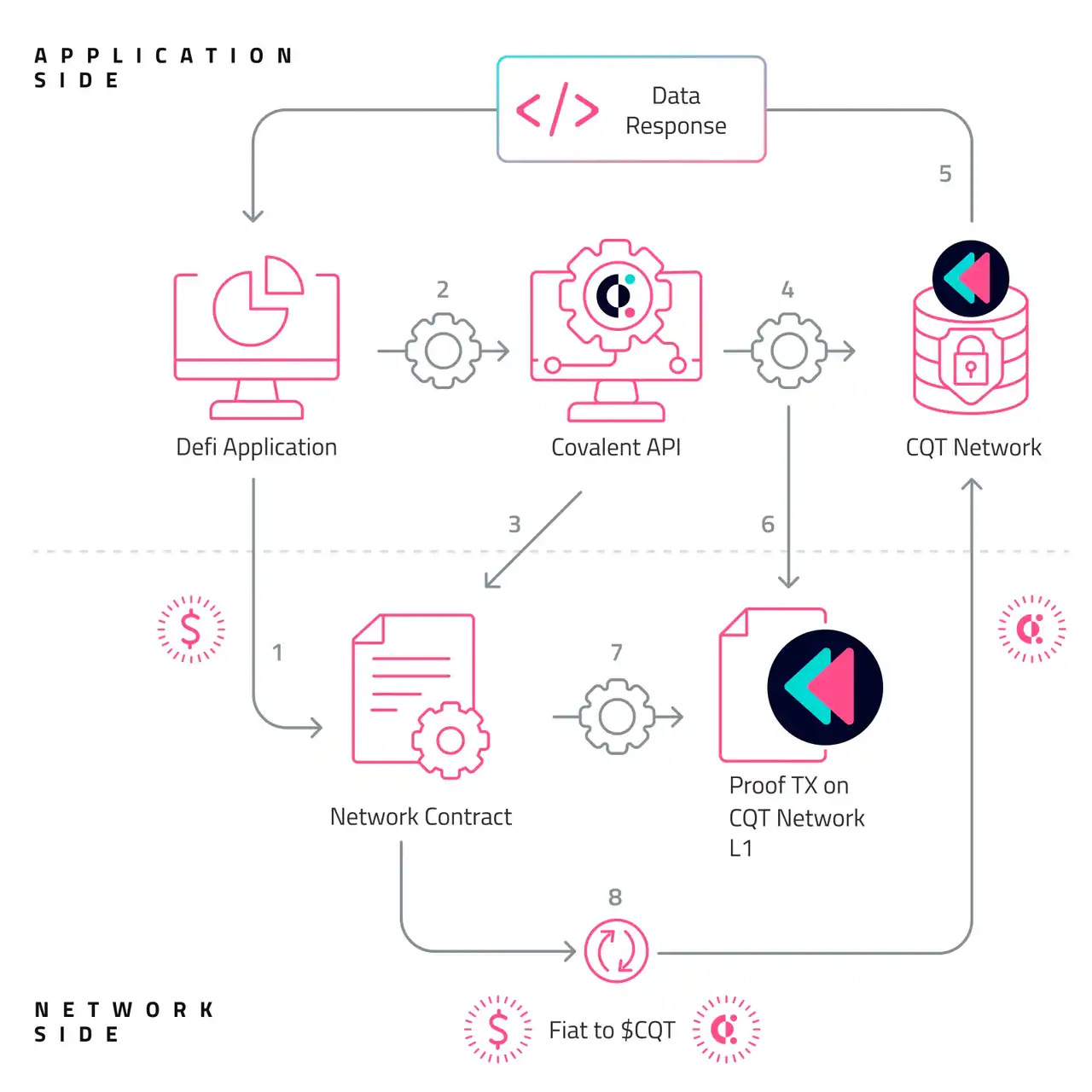 Covalent 的商业模式来自于需求方为数据需求支付费用(早期将通过 Covalent 进行),而费用将支付给网络运营商们,网络运营商需要质押项目代币 CQT 来提供服务。具体流程如下:
