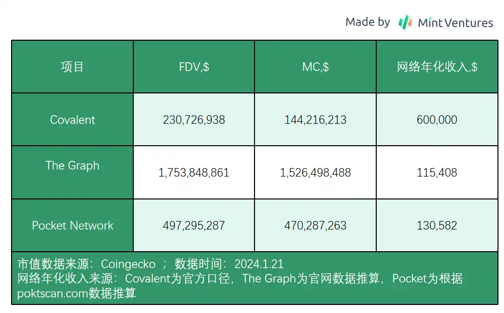其中 The Graph 是 Covalent 的直接竞品,估值具有很高的参考性,而 Pokt 作为去中心化 RPC 服务项目,作为 Covalent 同产业的上游,其估值同样具有一定的参考性。