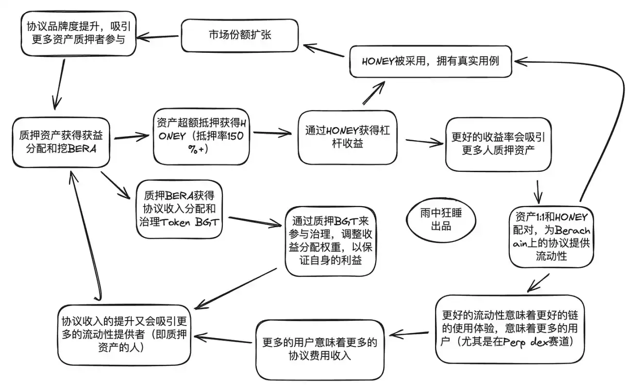 总结来说,用户将资产(如 ETH、BTC、USDC 等)存入系统,从而获得 Bera 代币。随后,系统利用这些资产与 Honey 配对,为 AMM 等协议提供流动性。这种增强的流动性进而吸引了更多的交易者和项目参与,从而为 BGT 带来更多的交易费用。由于 BGT 仅能通过质押 Bera 获得,这一机制吸引了更多用户质押 Bera 以产生 BGT。这样,系统不断吸引更多的资产加入,以获取 Bera,形成了一个飞轮,具体如下: