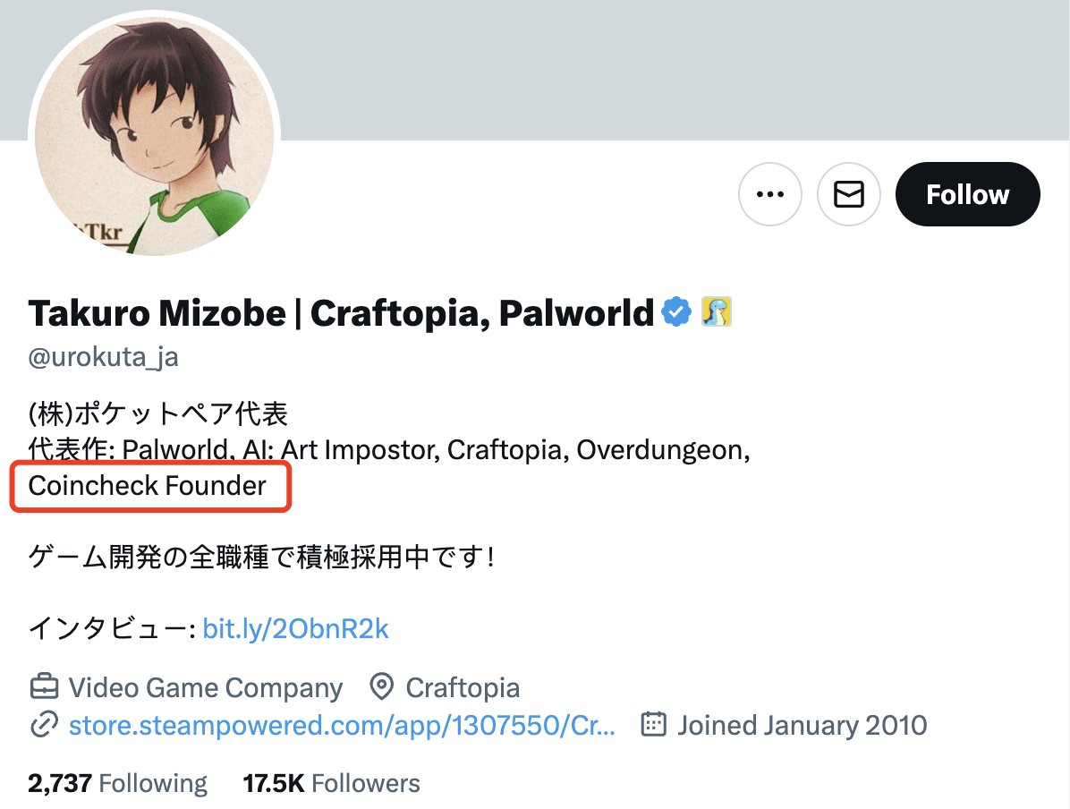 随着游戏热度只增不减,人们开始对这款只有四个早期开发人员的小成本游戏产生了好奇。而有人发现,Palworld 发行公司 Pocket Pair 的联创溝部拓郎(Takuro Mizobe)以前曾创办过一家加密货币交易平台,Takuro 的 X 账户简介中也自称是「Coincheck Founder」。