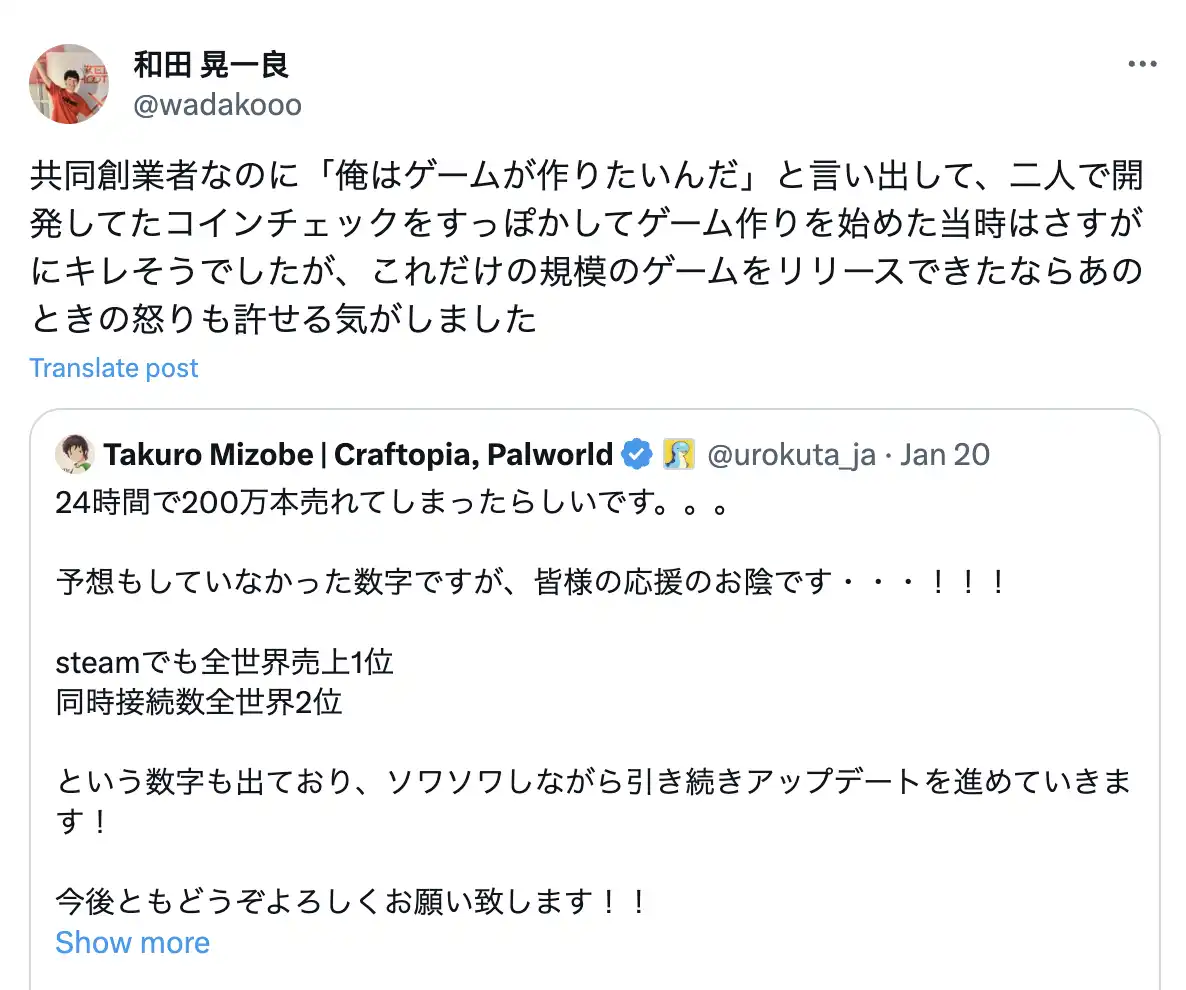 「尽管我是联合创始人,但当我说「我想做游戏」时,我们完全放弃了一起开发的 Coincheck,开始制作游戏。」Coincheck联创Koichiro Wada在Takuro Mizobe庆祝Palworld销量突破200万时评论道。