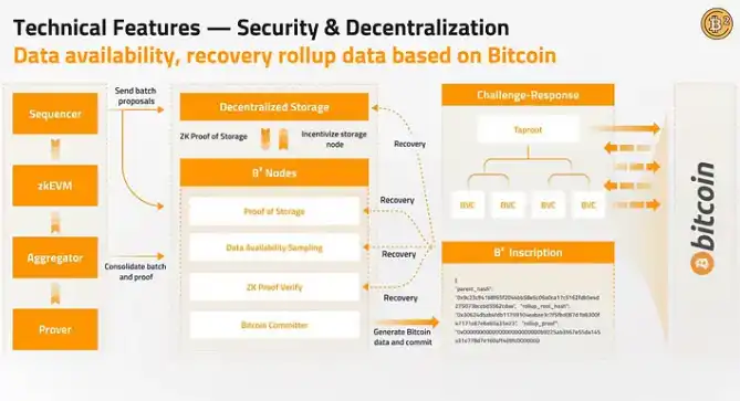 数据可用性层包括分布式存储、B²节点和比特币网络。该层负责永久存储 Rollup 数据的副本,验证 Rollup 的零知识证明,并最终在比特币上执行最终确认。