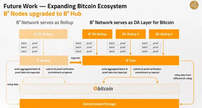 值得注意的是,B² Network 未来还将进行升级,B² Nodes 升级成为 B² Hub,B² Hub 将会为所有希望在比特币网络构建二层 Rollup 的开发者和项目方服务,提供基于比特币网络的数据可用层和状态转化验证/证明系统。