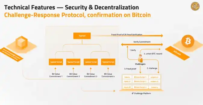 此外,B² Network 还会将 B²节点进行的零知识证明验证过程转化为比特承诺,将比特承诺写入比特币网络中,挑战者可以基于零知识证明验证的结果与比特承诺进行对比,发现作恶后通过挑战机制进行挑战解锁奖励,如下图。