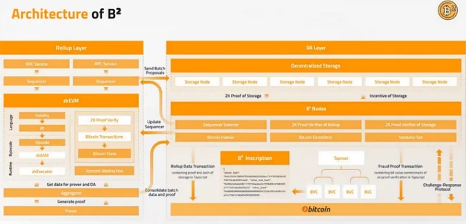 B² Network 的技术架构如下图所示,包括两层结构:Rollup 层、数据可用(DA)层。B² Network 旨在重新定义用户对比特币第二层解决方案的看法。