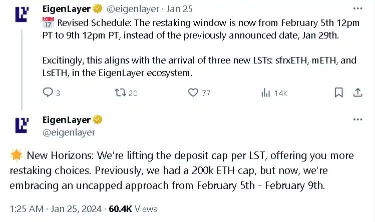 1 月 25 日,据 EigenLayer 官网信息,EigenLayer TVL 达 80.67 万枚 ETH,价值约合 17.88 亿美元。此外,团队正在引入一种分配再质押积分的新方法,该方法将把分配给任何 LST、LRT 或个人存款的再质押积分上限设定为未来发行总量的 33%。