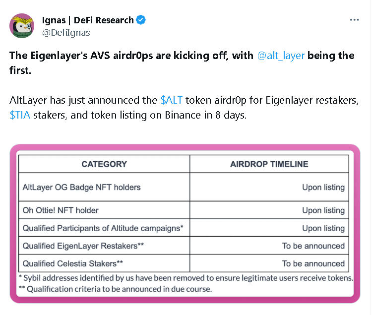 实际上,这意味着 EIGEN 的效用比 TIA 要低,因为它不会成为质押 AVS 的资产,这一因素将减少对该代币的需求,可能导致 EigenLayer 以较低的估值交易。