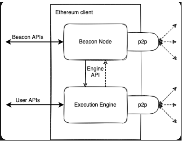 合并后,以太坊的执行性和共识层平行运行,二者通过引擎 API 的接口进行通信或信息互通。引擎 API 允许执行客户端向共识客户端请求区块信息,也允许共识客户端向执行客户端发送新区块或请求执行有效性证明(Execution Validity Proof)等。