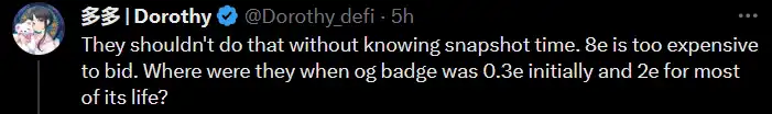 来自 altlayer 的「增长负责人」对此做出回应,「不知道快照时间就不应该这样做。8 ETH 的出价太昂贵了。当 OG 徽章最初为 0.3 ETH,其后大部分时间约为 2 ETH 时,他们在哪里?」