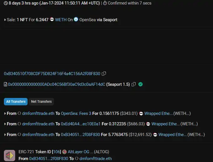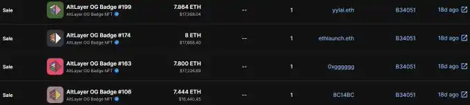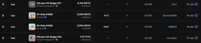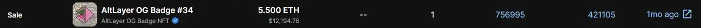 大约 18 天前,即 1 月 7 日(大约在拍摄快照前 10 天),该钱包持有者灵机一动,花费约 40eth 购买了 AltLayer 的 OG 徽章 NFT。