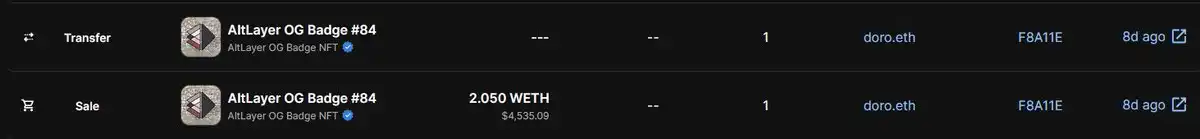 Twitter 账号使用的头像是 DigiDaigaku Genesis #1913,其地址解析到"doro.eth" ENS。在推特公告发布不到 15 分钟后,该地址就通过 OS 竞价卖掉了一个 OG 徽章,这是我注意到 Altlayer NFT 的第一件事。