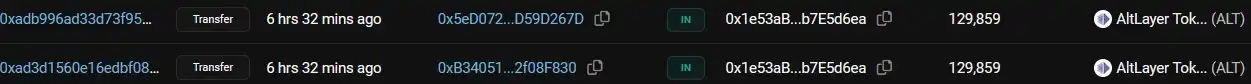 如上图所示,0x1e53ab 开头地址也从另一个 0x5ed0723 开头地址接收了一些 ALT 代币。