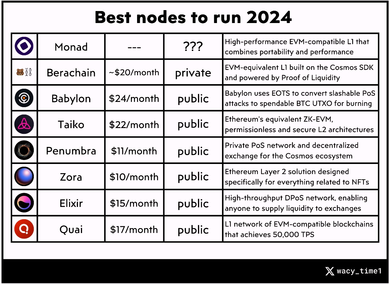 节点运行者正在赚大钱,SOL 节点赚取超过 500,000 美元,TIA 节点赚取超过 8 万美元。加密研究员 AlΞxWacy 收集了 8 个「最有钱途」的节点,这些节点确实有机会慷慨地奖励用户,目前关注的人并不多。值得注意的是,维护一个节点的费用每月为 10 至 30 美元。这笔钱用于启动 VPS 服务器。如果您的资源有限,建议选择您最感兴趣的项目。
