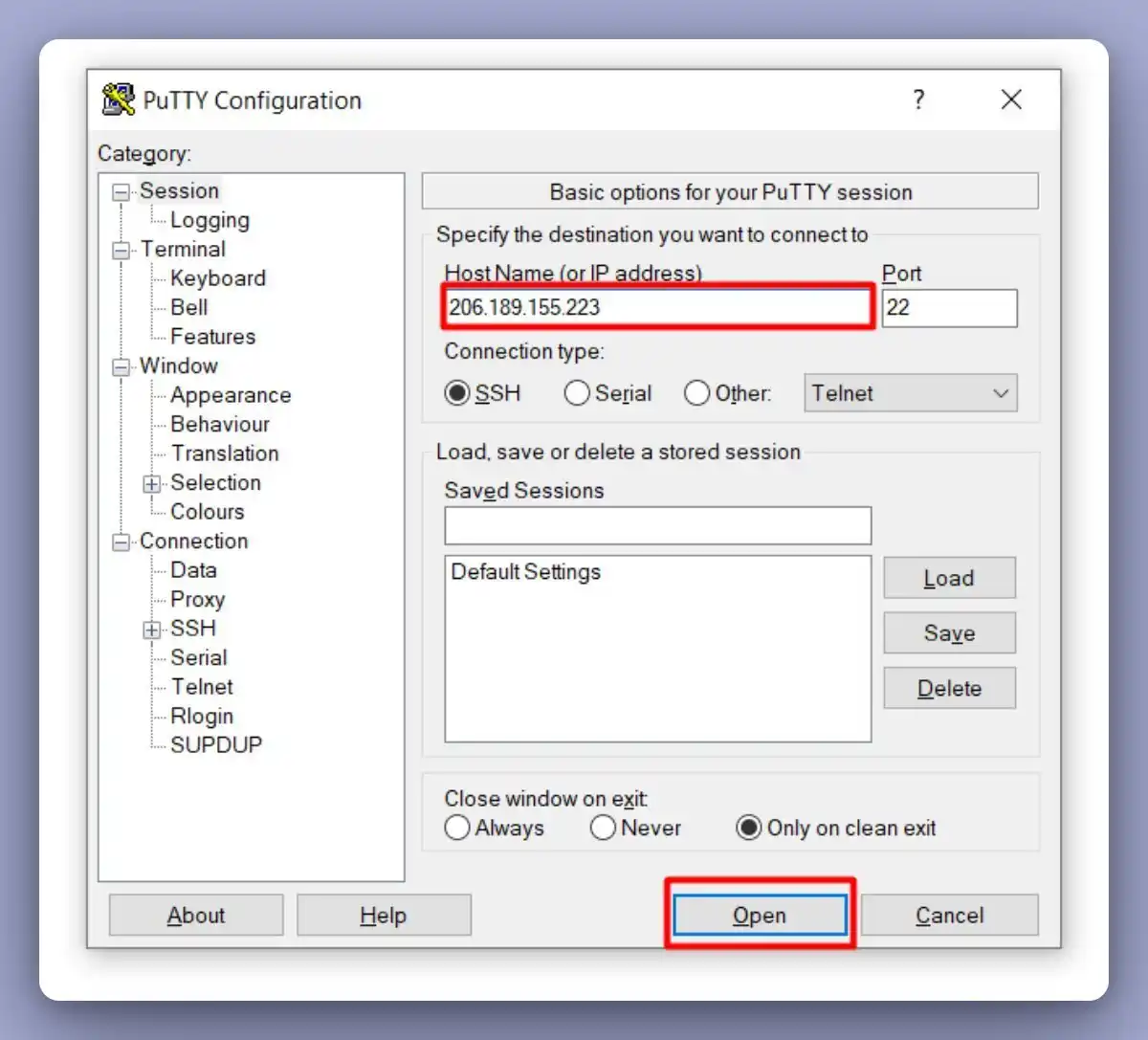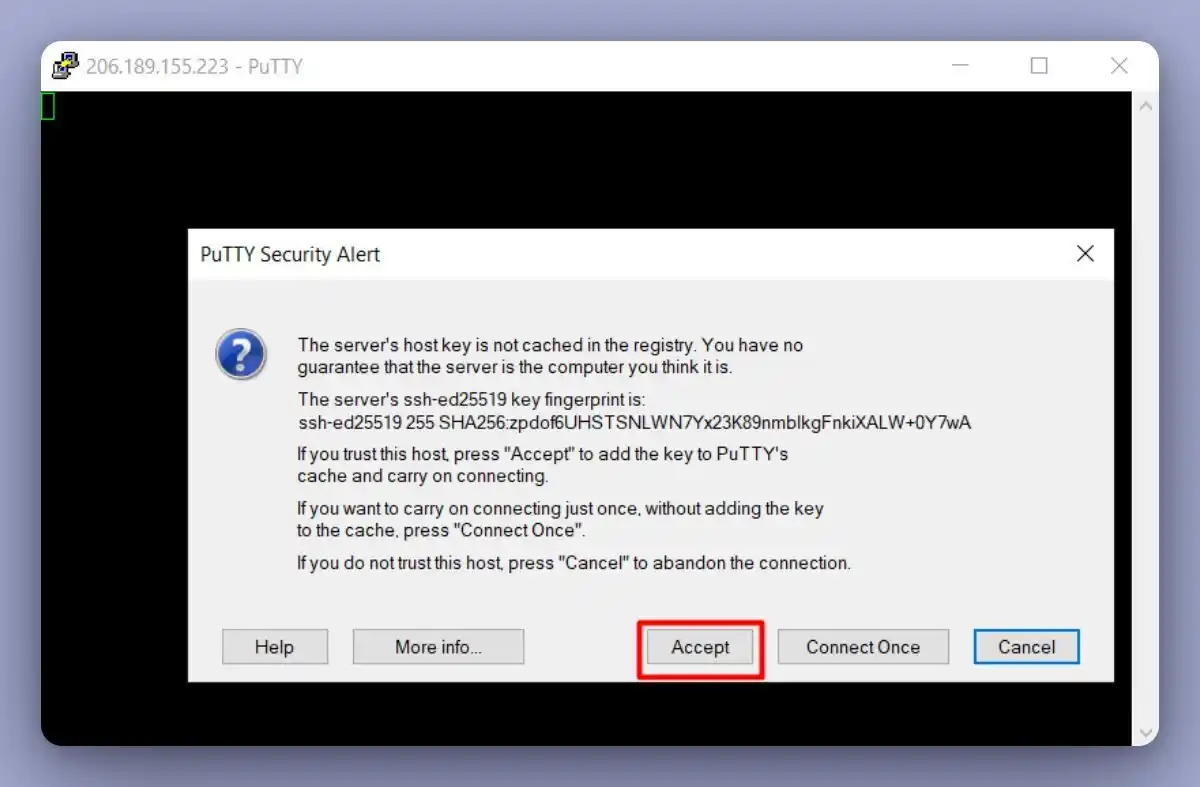 · 粘贴您服务器的 IP 地址,然后单击「打开」和「接受」