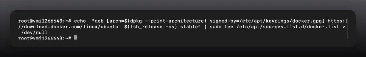 echo "deb [arch=$(dpkg --print-architecture) signed-by=/etc/apt/keyrings/docker.gpg] https://download.docker.com/linux/ubuntu $(lsb_release -cs) stable" | sudo tee /etc/apt/sources.list.d/docker.list > /dev/null