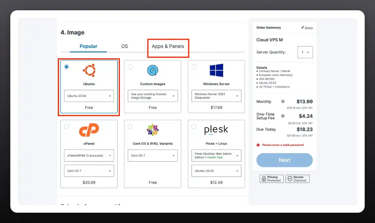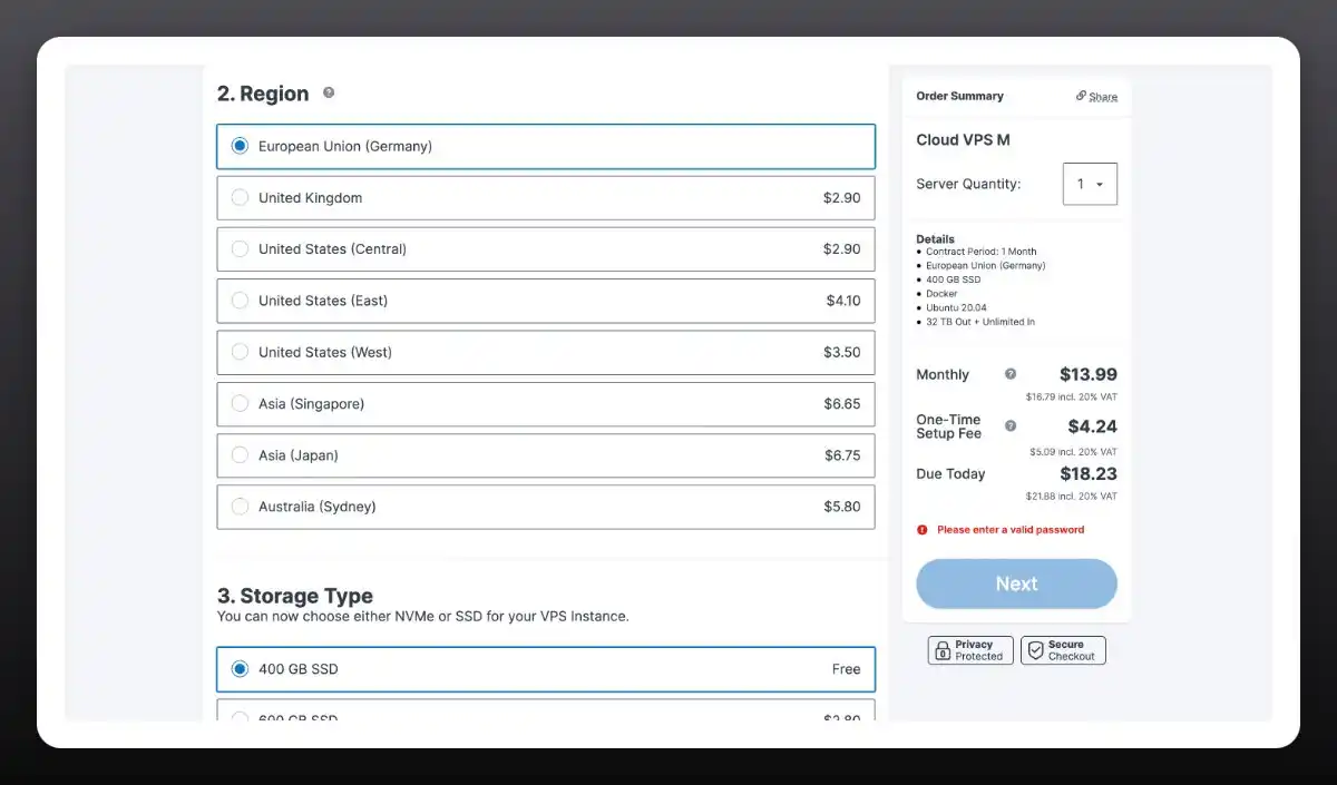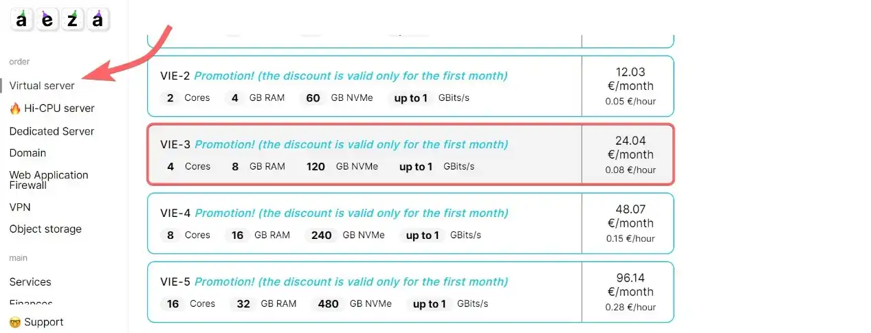 · 选择选项:虚拟服务器-->专用-->Vienna 3:4 Cores/8 GB RAM/120 GB SSD