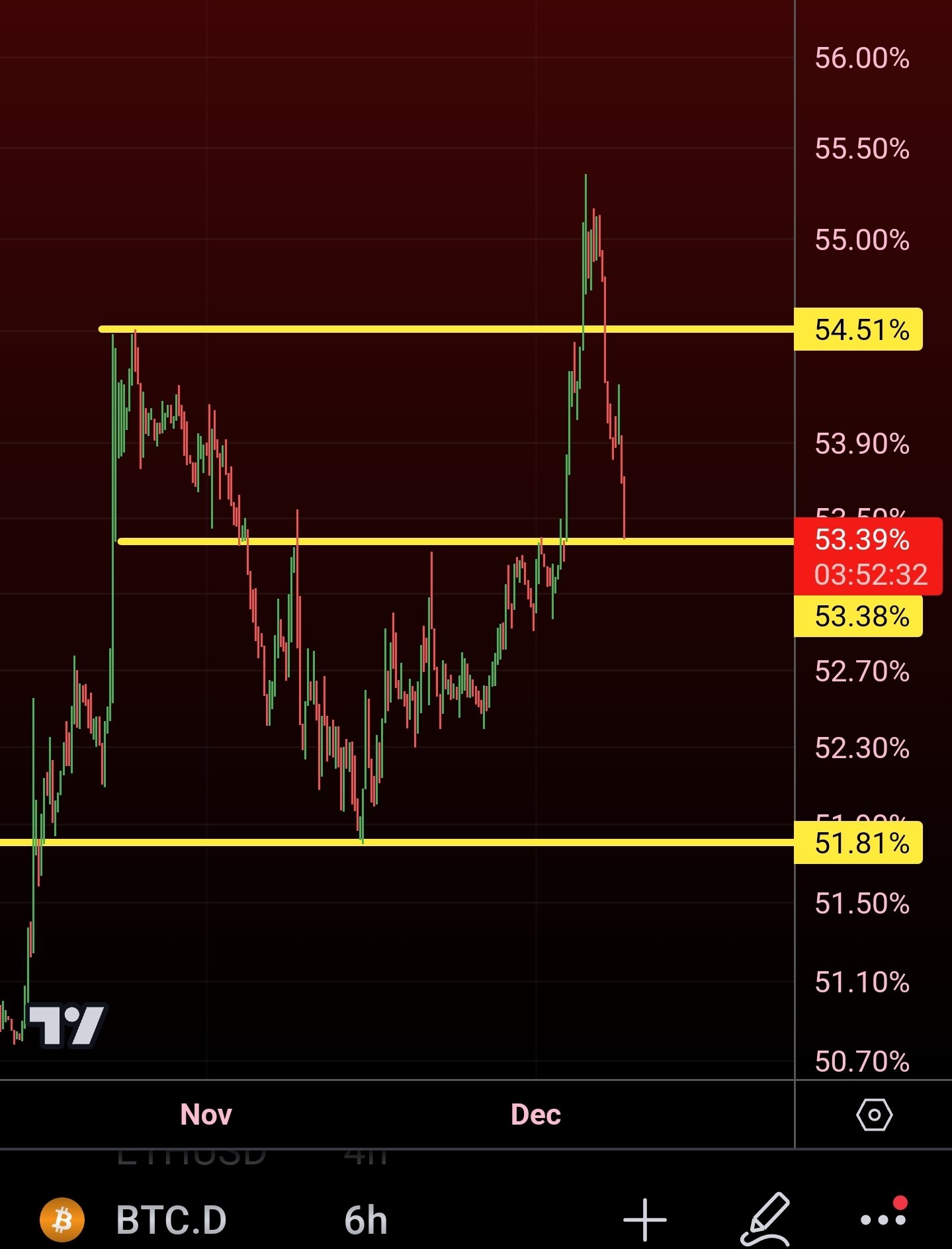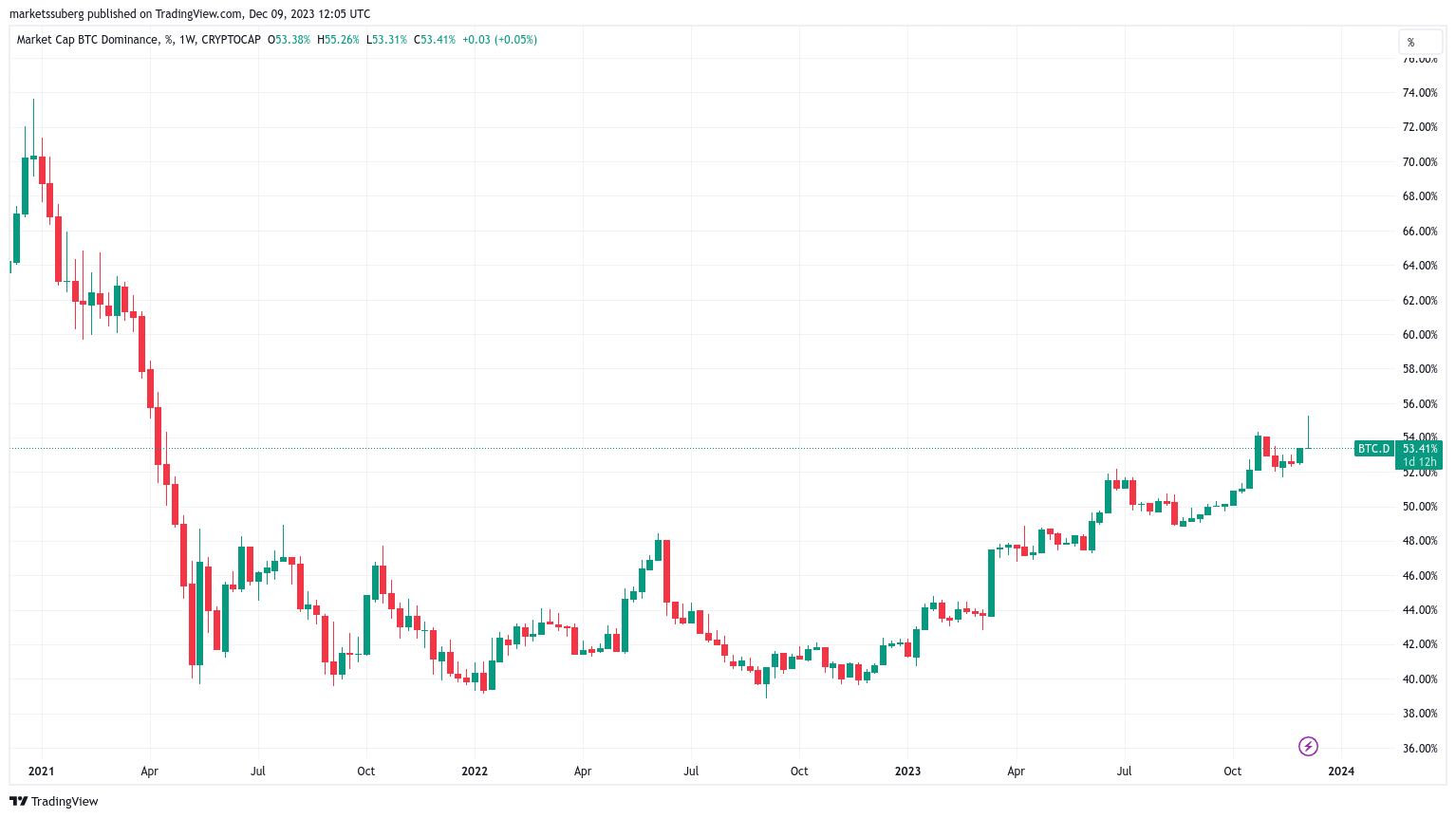 Hyland 提到了比特币主导地位最近的飙升,12 月 6 日达到 55.26%,这是自 2021 年 4 月以来的最高水平。随后,比特币市场迅速反转,上行势头得到遏制,截至本文撰写之时,比特币的市场支配地位为 53.4%。