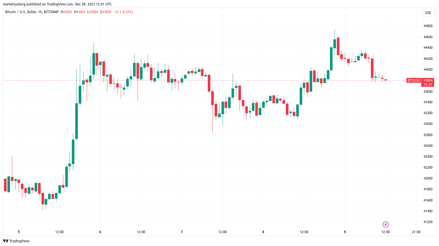 Cointelegraph Markets Pro 和TradingView的数据跟踪显示,比特币随后回到了 44000 美元关口下方,并在盘中巩固了自己的区间。