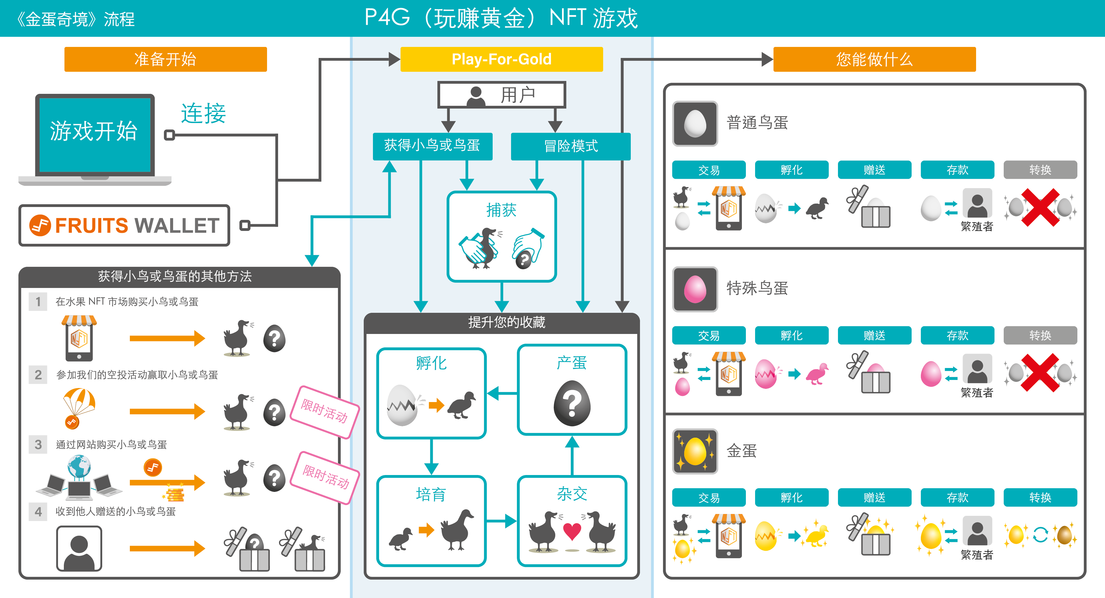 可从Fruits的NFT市场购买鸟或鸟蛋;可参加Fruits空投活动,获取鸟或鸟蛋;可通过网站铸造鸟或鸟蛋;可接收他人赠送的鸟或鸟蛋。普通的鸟蛋可以孵化出小鸟,可饲养这些小鸟并让其交配。最终,玩家可获得一枚金蛋,并可将其兑换成实物黄金。